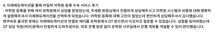 – 어학원 등록을 위해 여러 유학원에서 상담을 받았었는데, 주세환 원장님께서 친절하게 상담해주시고 어학원 시스템과 비용에 대해 명확하게 설명해주셔서 미래에듀케이션을 선택하게 되었습니다. 어학원 등록에 대해 고민이 많았는데 편안하게 상담해주셔서 감사했습니다.